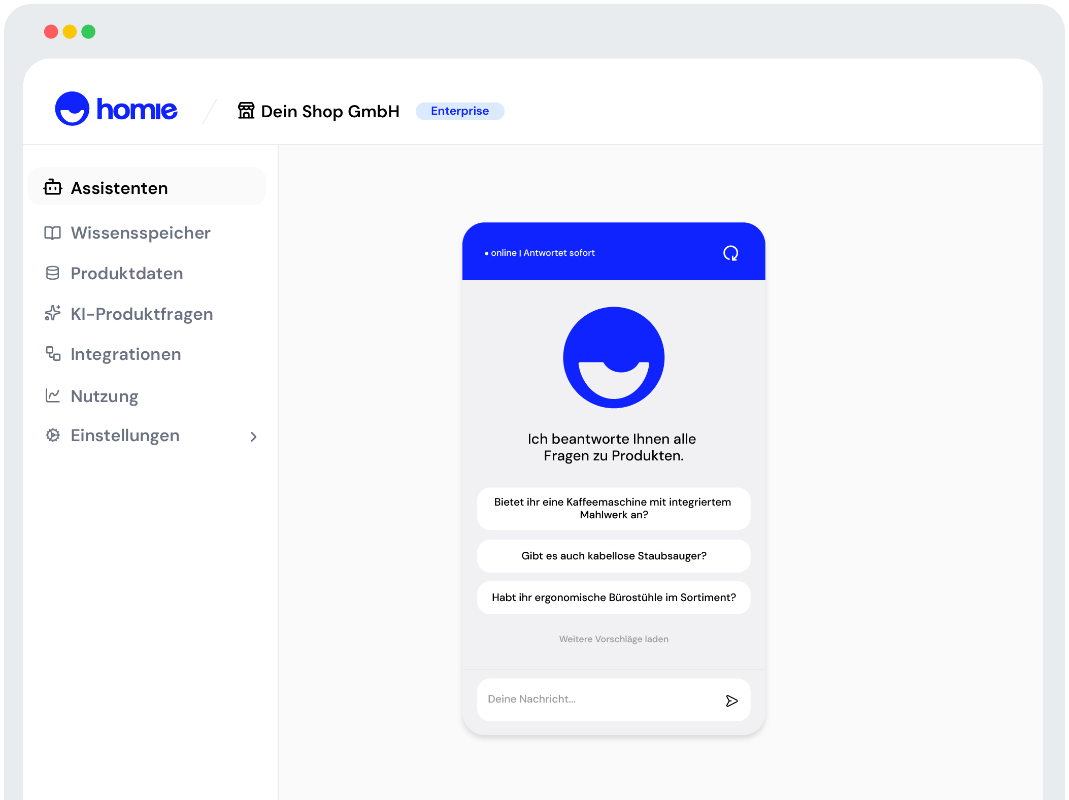 homie AI beantwortet die Fragen deiner Kunden in Sekundenschnelle, gibt passende Empfehlungen und führt sicher durch dein Angebot. 7 Tage die Woche, 24 Stunden am Tag. Egal, ob du einen Online-Shop hast, oder nicht.